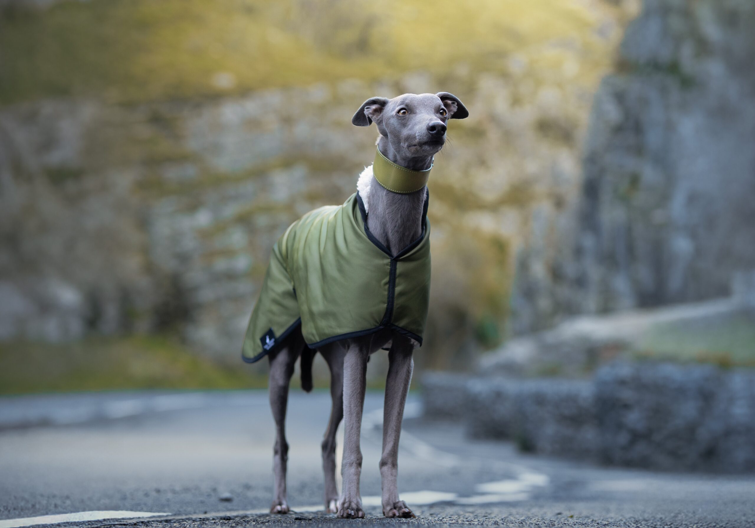 Our Olive Green Waterproof Coat with a soft fleece lining is designed specifically for Whippets, Greyhounds, Italian Greyhounds, and Lurchers. It is the perfect solution for keeping your shivering sighthound warm and dry during wet and cold walks.